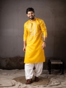This readymade kurta pajama set is crafted from soft linen fabric and enhanced with elegant embroidery work. Paired with an art silk pajama, it is perfect for festive and party occasions.
